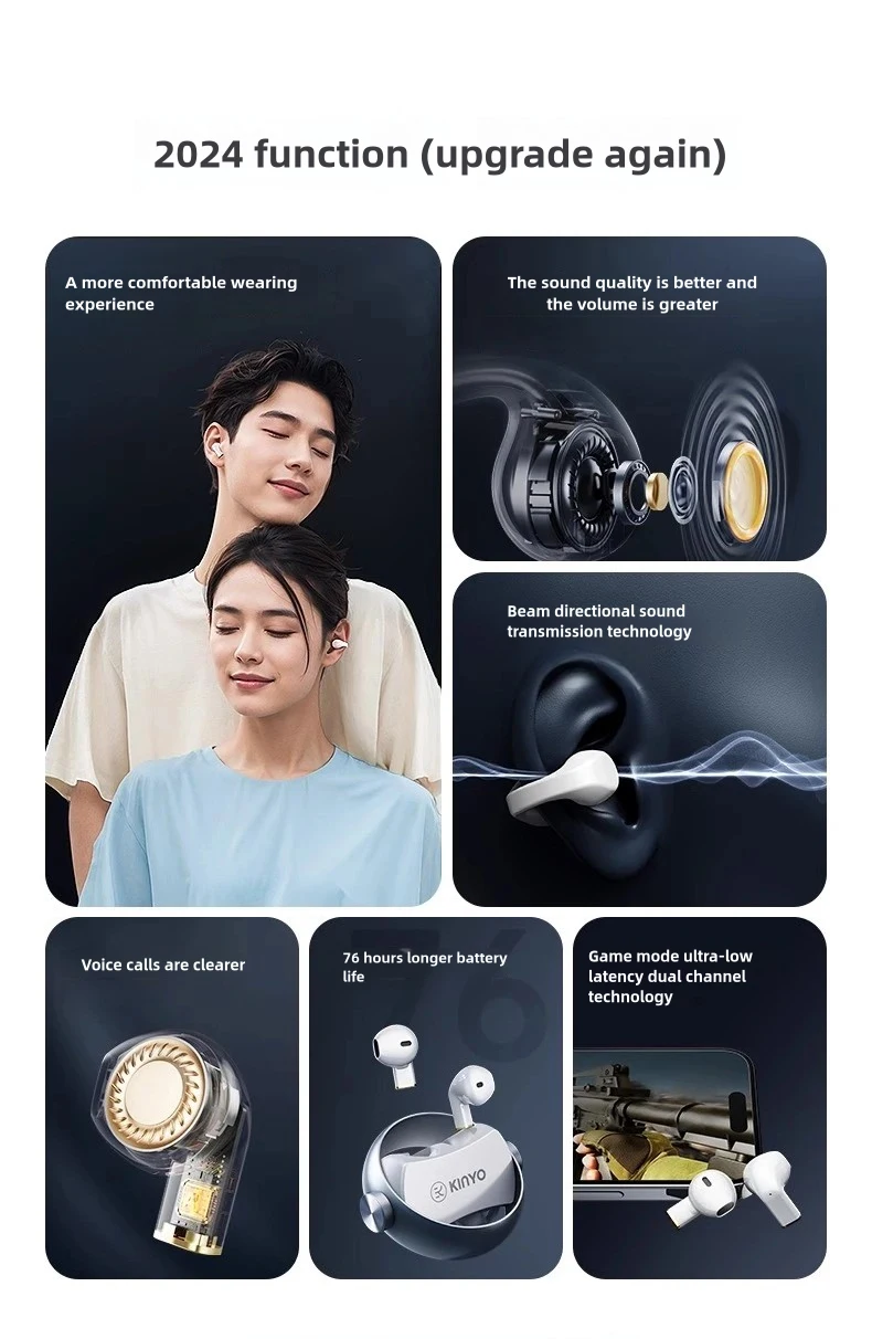 Two pairs of earphones can be switched at any time, in-ear type and clip-on ear type. The dual earphones can be used in turns with a long battery life of 76 hours.