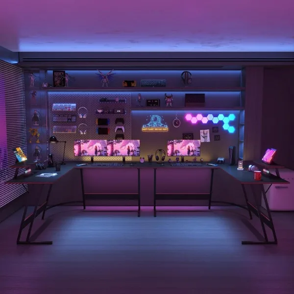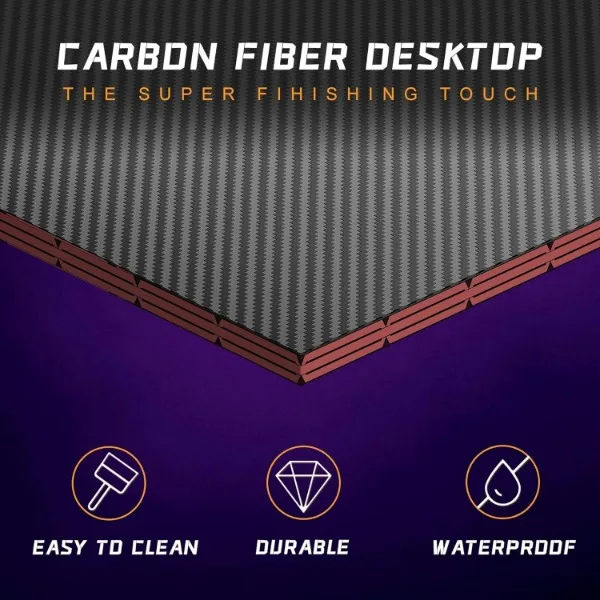 This L shaped gaming desk is made of carbon fiber board and high quality steel legs. L shaped design, carbon fiber surface, detachable monitor stand and ample space. Give your gaming and working a comfortable and excellent experience with gaming desk.